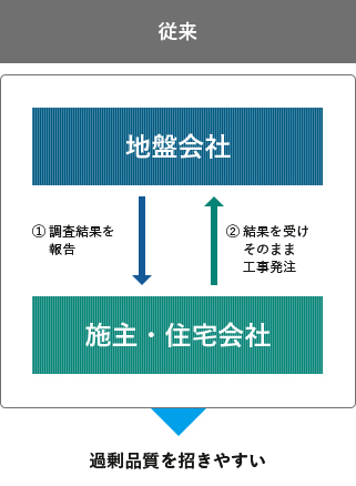 実は、住宅の地盤調査に一般的に用いられるスウェーデン式サウンディング試験は半自動の調査方法であり、精密な調査データを採取することができないことから、調査データの解析基準はいまだ確立されておらず、地盤調査会社では断定的な判断ができないのが現状です。改良工事の要不要の判断は難易度の高い技術力を要するものなのです。そのため、地盤調査会社が安全度を高くするために、過剰な改良工事になりがちなのです。