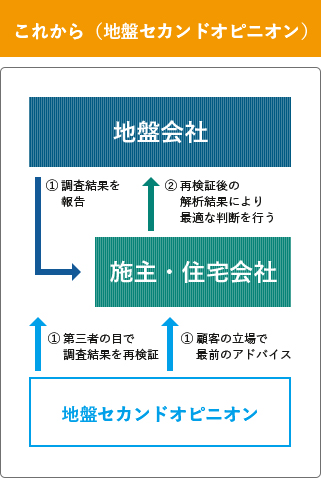セカンドオピニオンとは、「より良い決定をするために、もう一人の人から聴取する意見(大辞泉)」という意味です。地盤業界においては、地盤調査会社が行った調査データを第三者がチェックするという仕組みがありませんでした。そのため、ほとんどの場合、地盤調査会社の調査結果だけに基づいて地盤改良工事が行われています。