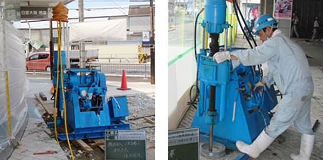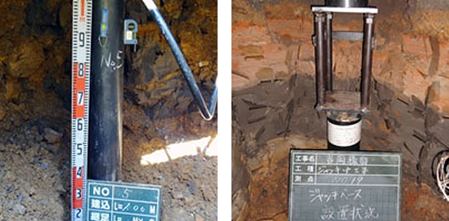 凝固する性質を持つ薬液を地盤中に圧入し、透水性の減少、地盤の強化、変状防止などを図ります。「狭い場所で施工可能」「産業廃棄物が非常に少ない」などの特徴があります。